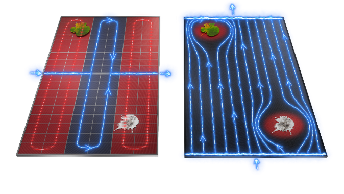 - Elevata potenza anche con ombra: mentre i moduli convenzionali bloccano intere stringhe di celle in caso di ombreggiamento, la matrice 2D consente un bypass intelligente: la corrente può fluire bidimensionalmente all’interno del modulo, deviandosi attorno alle aree ombreggiate. Ciò aumenta significativamente la resa in condizioni reali, nei test fino al 70% con ombreggiamento parziale.